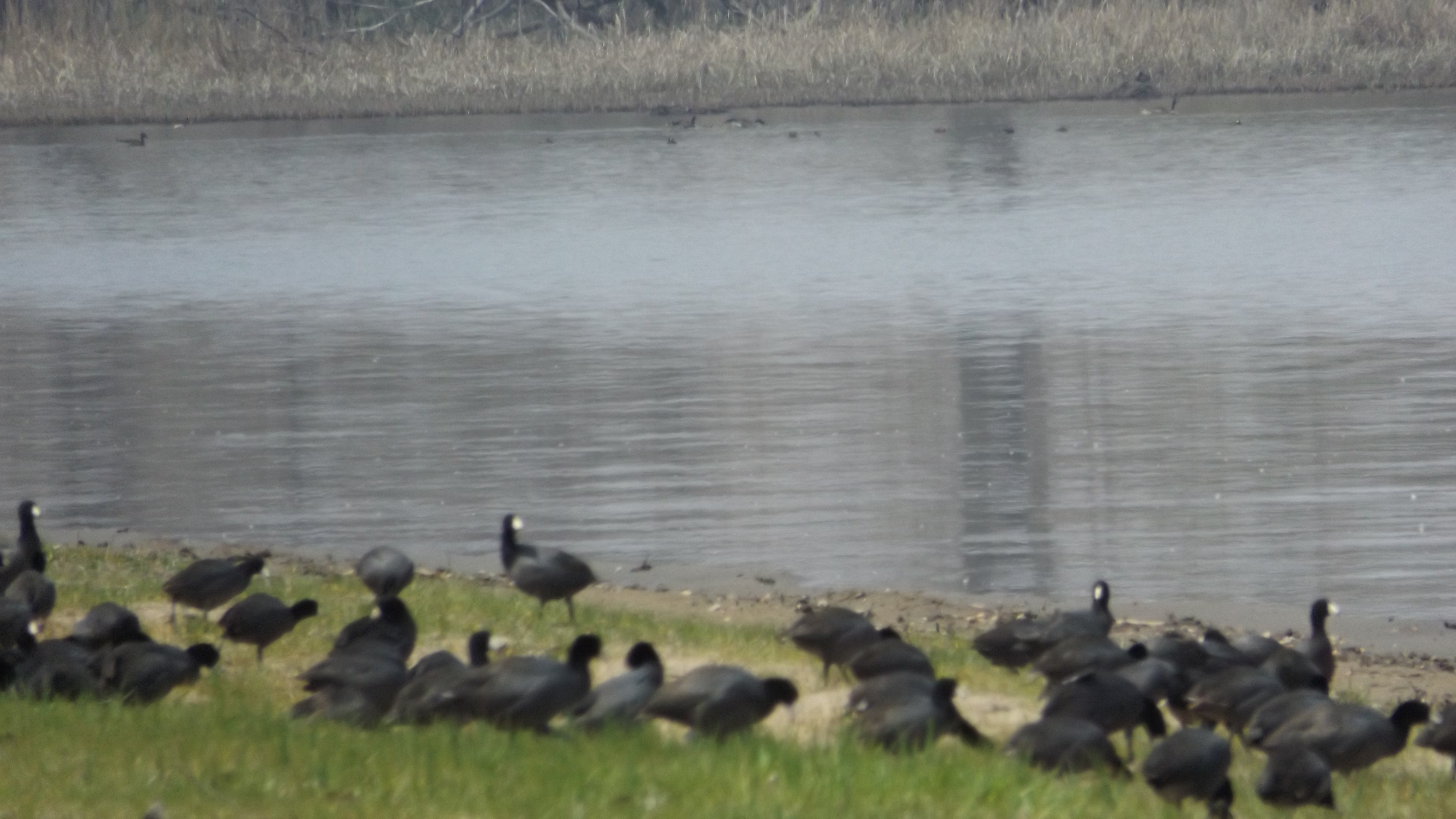 The black birds above are coots. You don’t see them on land often, and along with buzzards and crows, coots are considered the least edible birds out there. They rank behind owls. Otherwise, why would old southern rednecks say “hotter than a boiled owl”?