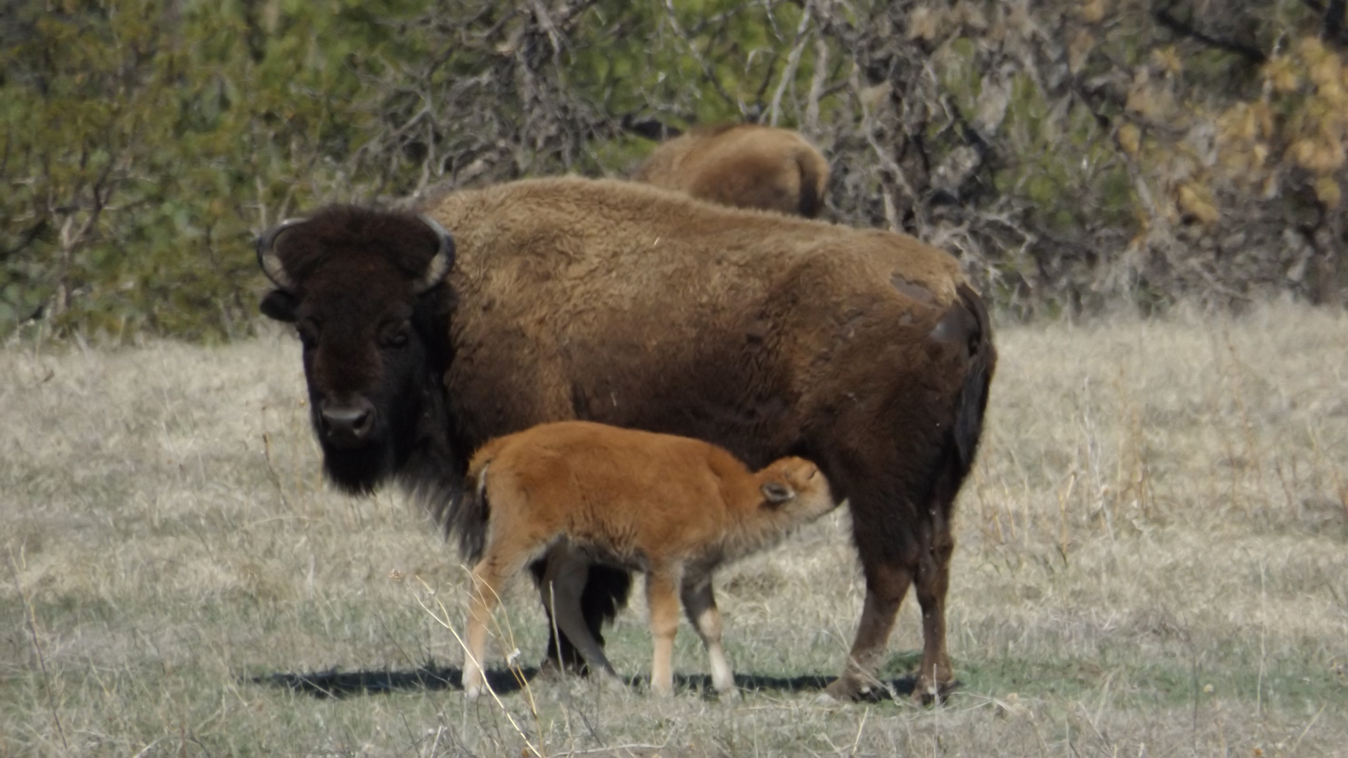 Saturday we visited Niobrara National Wildlife Reserve. We were a quarter mile into the park when up there on the ridgeline loomed the silhouette of a buffalo bull: a big boy, for sure. Moments later we saw the whole herd behind him, maybe 100 of them. These bison are more tame than wild so they didn’t stampede nor would any run. Still an impressive sight, and there was more to come. A pheasant cock ran across the road sporting mating season colors. Then came a prairie dog town: a bunch of energetic scamps, them. The elk were hiding, but the river was running clear and clean, and on the way back we noticed that the buffalo calves had come out of their hiding places and were now nursing. What a place this must have been 200 years ago!