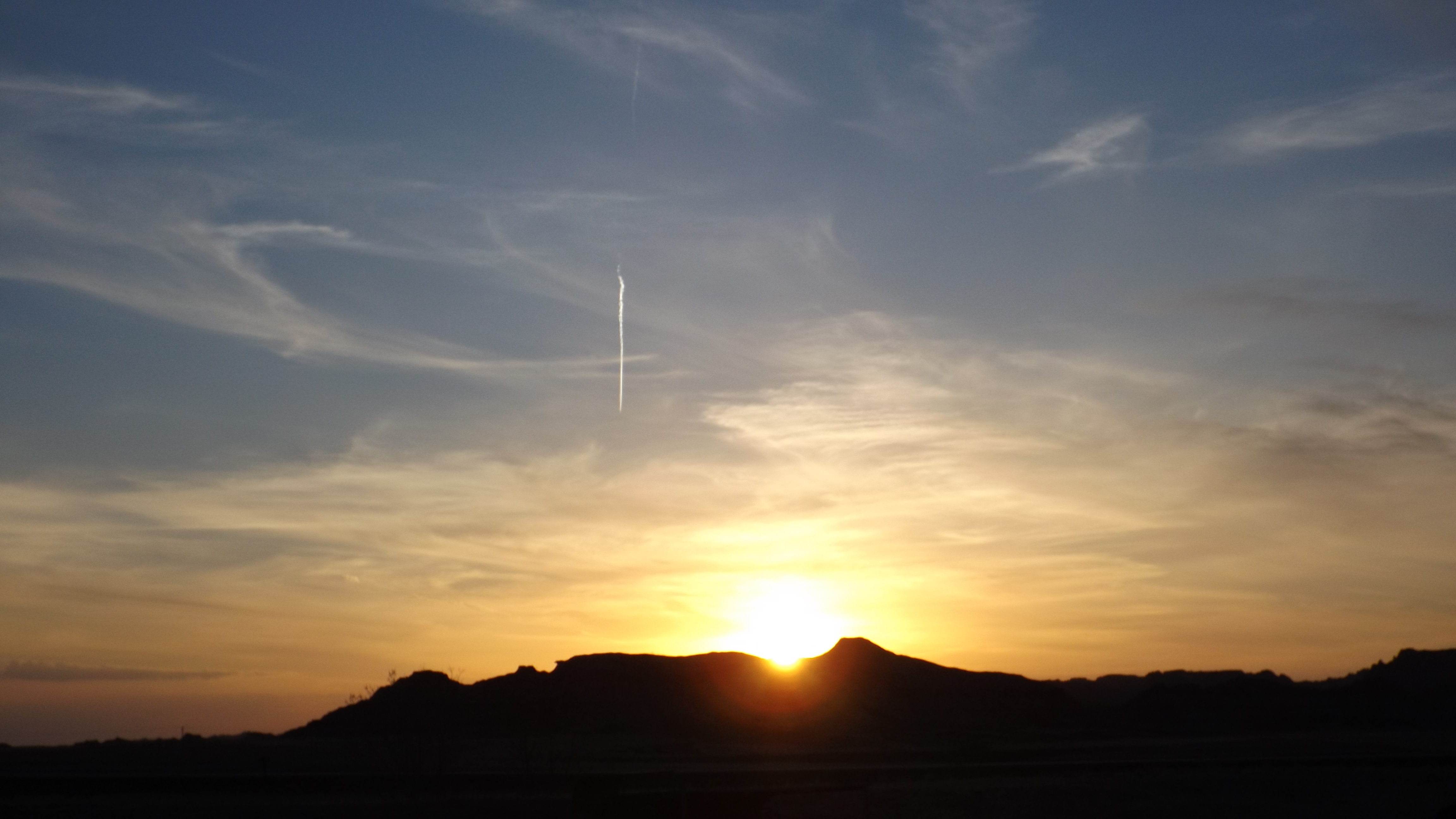 We had to negotiate some rugged roads that barely qualify as blue highways (I’d call SD 73 gray). But we got to The Badlands around 5:00, tried our luck at the park’s only campground, and BINGO! We had our choice of half the sites. The horizon is incredibly beautiful on three sides, and Kat took a bunch of pictures, including some killer sunsets. By the way, Monet was right: depending upon the angle and intensity of the sun, everything will look different at various times of day.