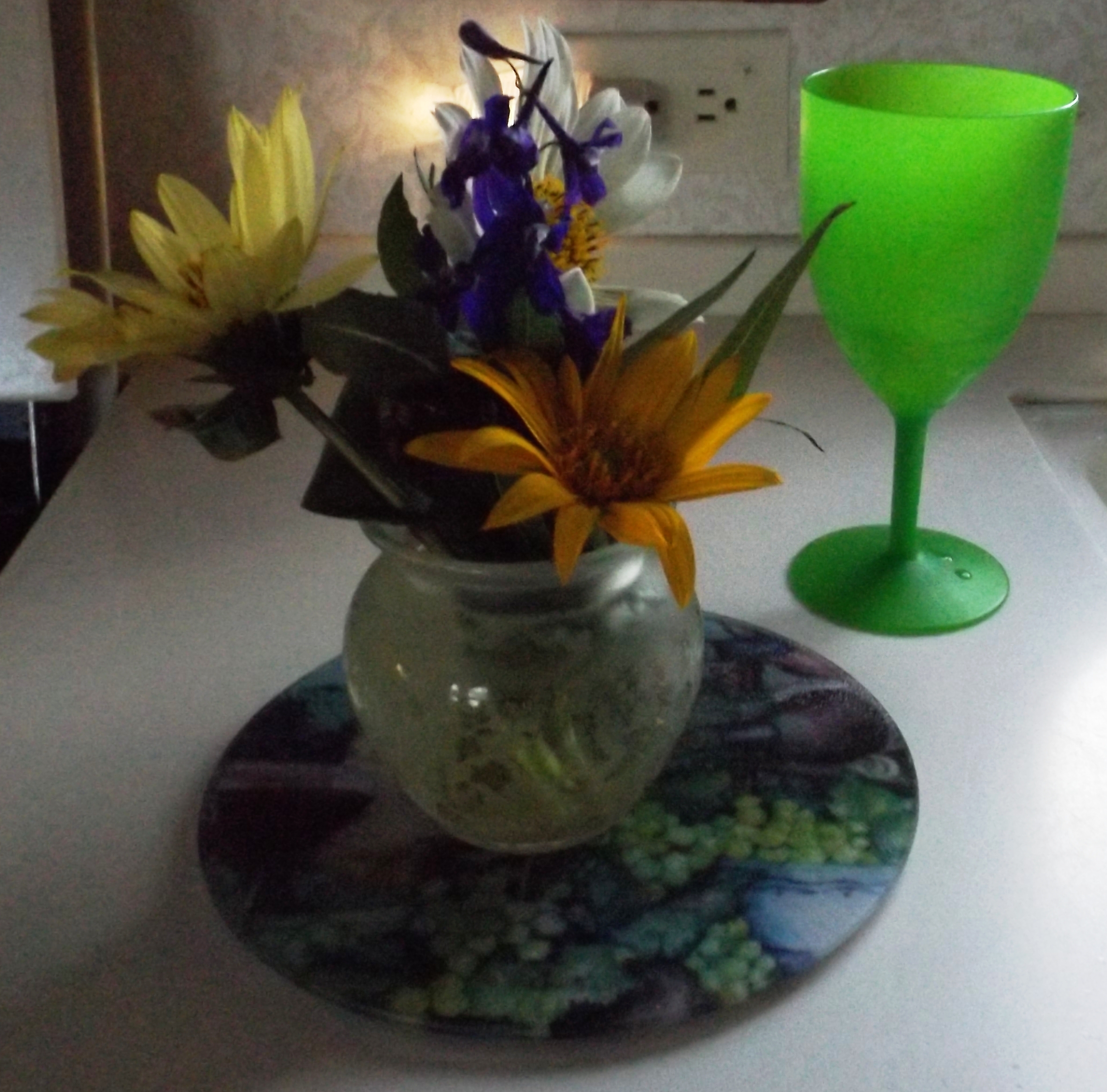 Kat and I are serious wildflower fans, and to our surprise the fleurs are already out in force. Right now I don’t know what these are called, but if I can find them on Google, this post will be updated, pronto. The arrangement of what looks like wild daisies and a violet was picked in Idaho, a few miles outside Yellowstone.