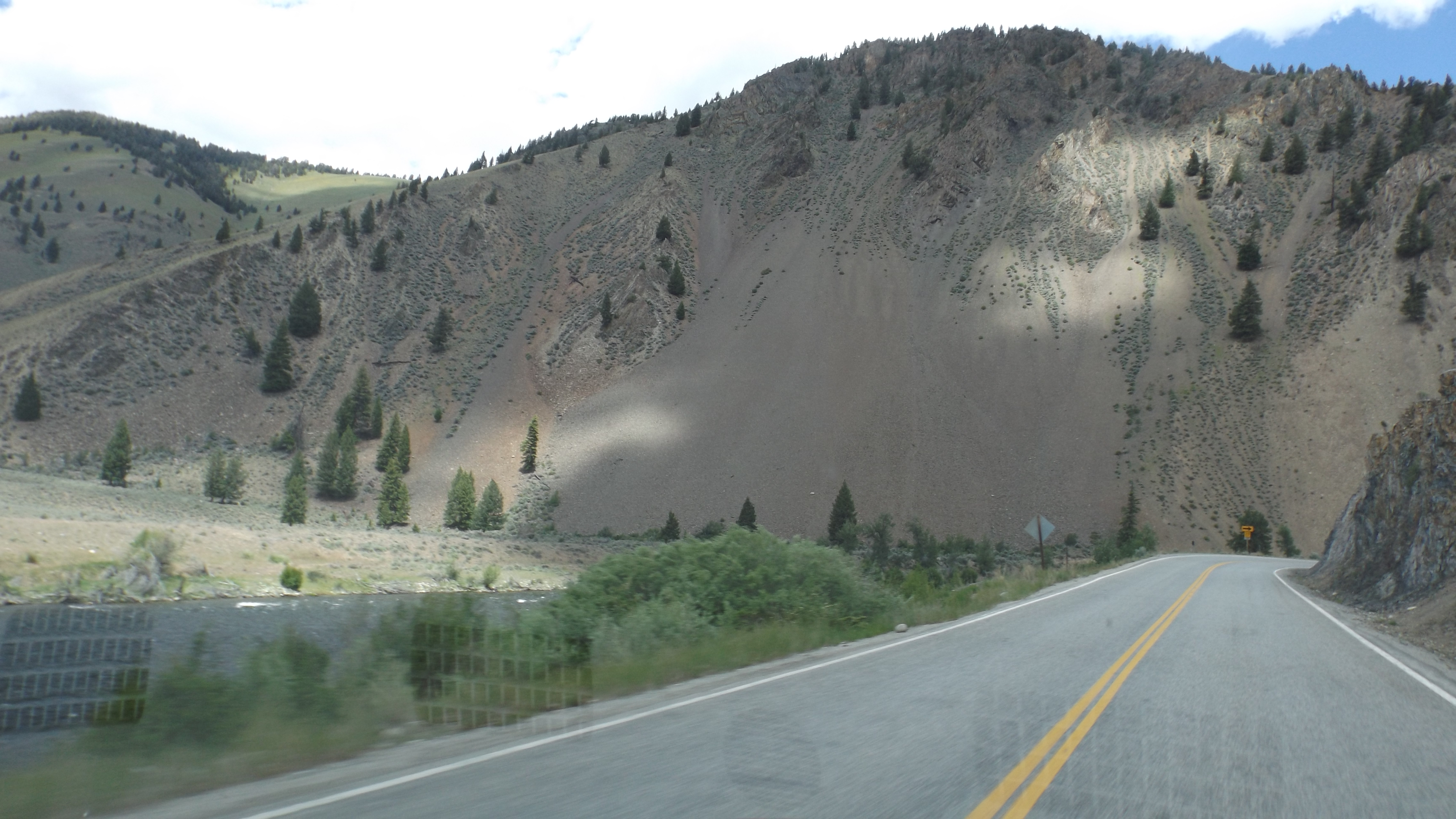 Trusting Eric the Bluegrasser’s route to Glacier, we took the Sawtooth Scenic Byway a/k/a blue highway 75 to Stanley. It follows Wood River part of the way and then picks up on the beginning of the Salmon River when it more resembles a good irrigation ditch. Near Stanley, Hwy 75 becomes the Salmon River Scenic Byway, and “scenic” is pure understatement. What a beautiful drive! Ok, there’s a six mile stretch of 7% downgrade that is a bit stressful, but only moderately challenging even pulling a 28’ Airstream. My Crankshaft Value (the number of vehicles wanting to pass) had approached double-digits when a Harley rider blasted past me and the first four in line behind me. He was passing us blind coming into a left-hand mountain turn. As I wondered if he’d become a hood ornament it struck me that there goes one of way too many guys on the planet whose colei outweigh his gray matter. Lest the VW Westphalia immediately behind us try the same move I pulled over at the next overlook.