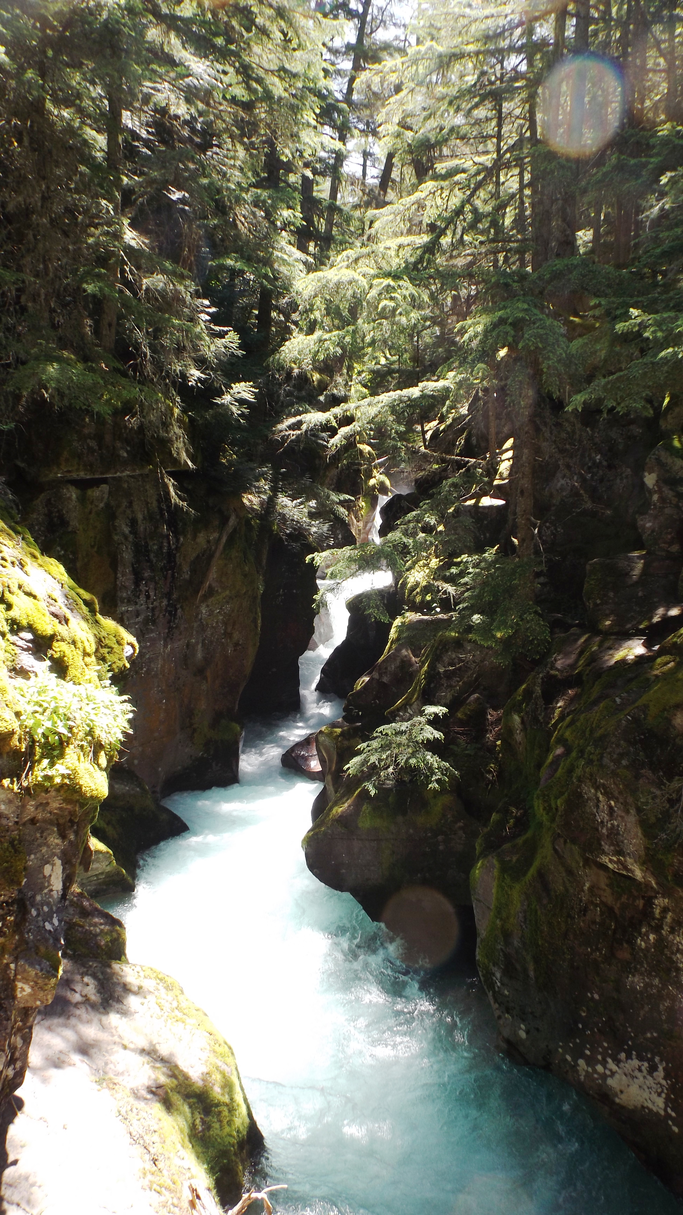 We drove the Red Sled into Glacier to hike the Cedar Trail. There is plenty of parking near the trailhead, but this is the peak season, and we found no space. “Every cloud has a silver lining” and here the benefit of road construction is ten minute gaps in on-coming traffic. We used that gap to make an impossible U-turn and drove six miles back to the Lake MacDonald Lodge parking lot. From there we caught a shuttle and walked the beautiful Cedar Trail. These giant cedars live here because the mountains to the east block the clouds coming off the Pacific, and those clouds drop serious precipitation while moderating the winter temperatures. The water in these streams comes from snow melt and springs, and is unbelievably clear everywhere in the park.