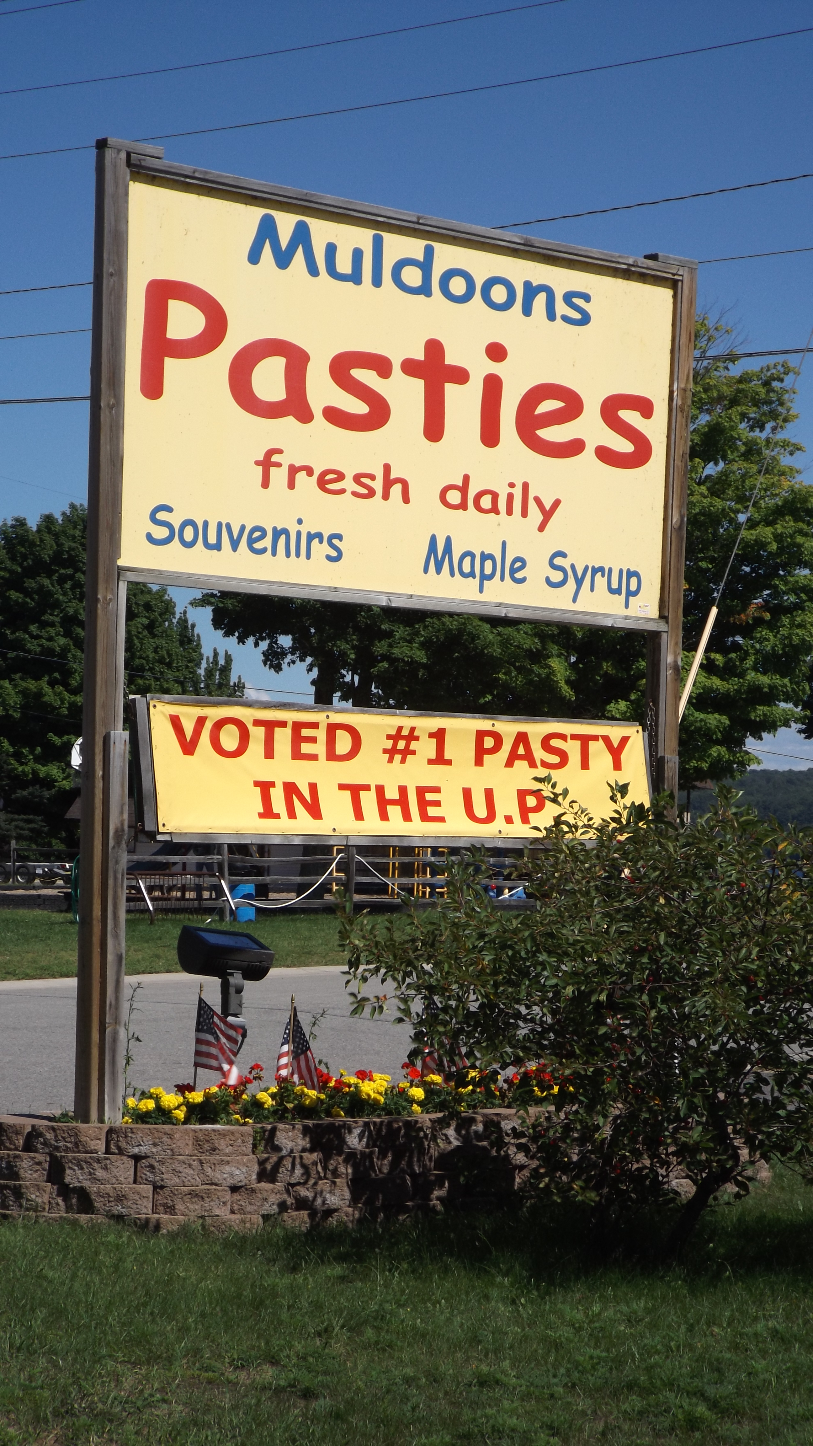 On a grocery trip to Munising we noticed a billboard offering Pasties. This is not that essential element of a stripper’s costume; it is more like a big baked meat and veggies pie, with the first syllable pronounced as in “past” and not “paste“. I had seen them in the freezers of several Upper Peninsula stores, and the curiosity was building. We bought two beefs at Muldoon’s and were offered gravy to go with them, although “ketchup is best”. On the way out there was a poster of a fellow with a huge pasty before him beside a six-pack. The caption: “Yooper Seven Course Meal”.