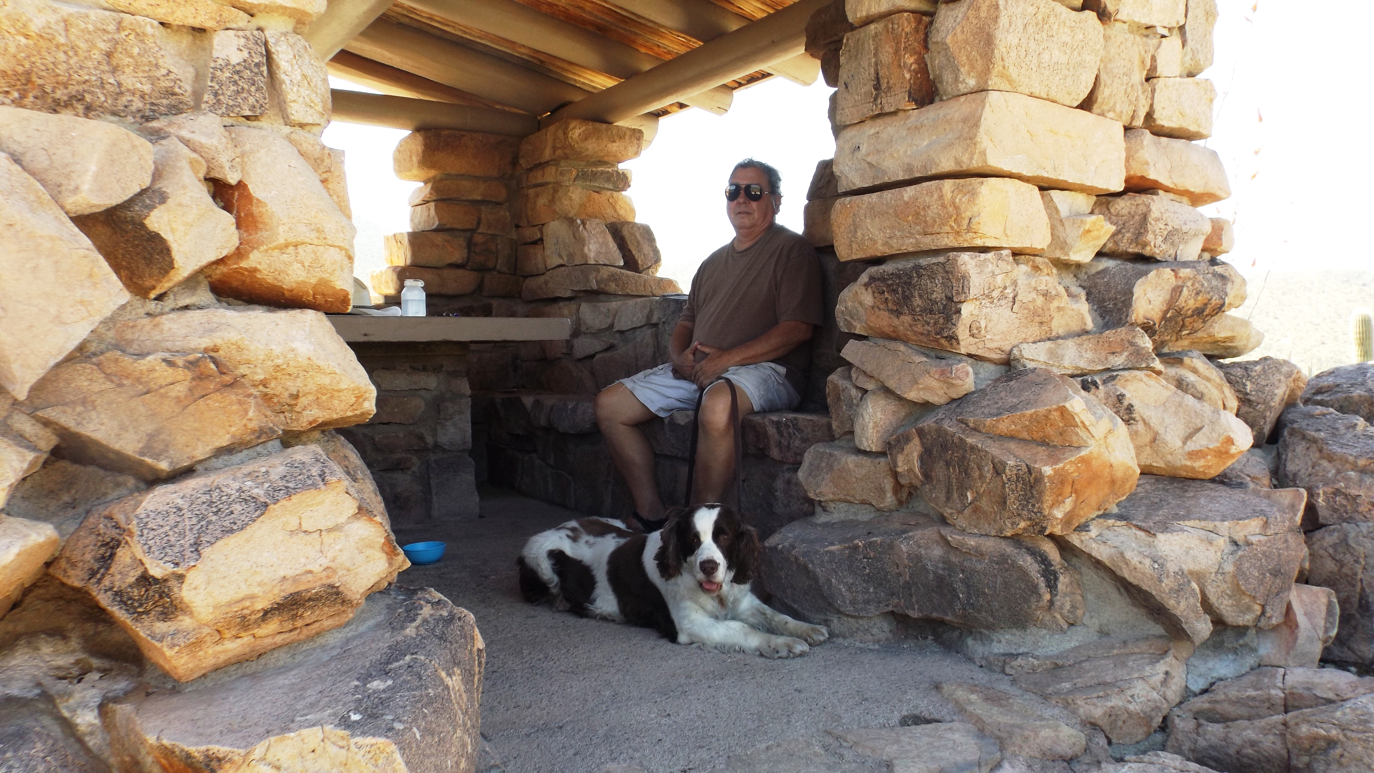 The Visitors Center is cool and very helpful. Kat got some back-of-an-envelope instructions on short driving tours that end in shorter hikes. There was a lot more corduroy dirt road than anybody wanted or had bargained for, but the scenery was as spectacular as a desert’s can be. We climbed up into a rock shelter and wished we’d brought lunch; the view was from a shaded picnic table with very clear vistas. At the table with all that rock around us the temperature was 15 degrees cooler. We celebrated with the last of our water. It must have rained a few weeks earlier – barrel cactus blooms were everywhere and the ocotillo was in full riot mode. There were several spindly varieties of wildflower showing off their colors, and even the non-blooming cacti clearly had new growth and fresh, sharp spines. Winter is over in Tucson, and life of all kinds is visibly relieved.