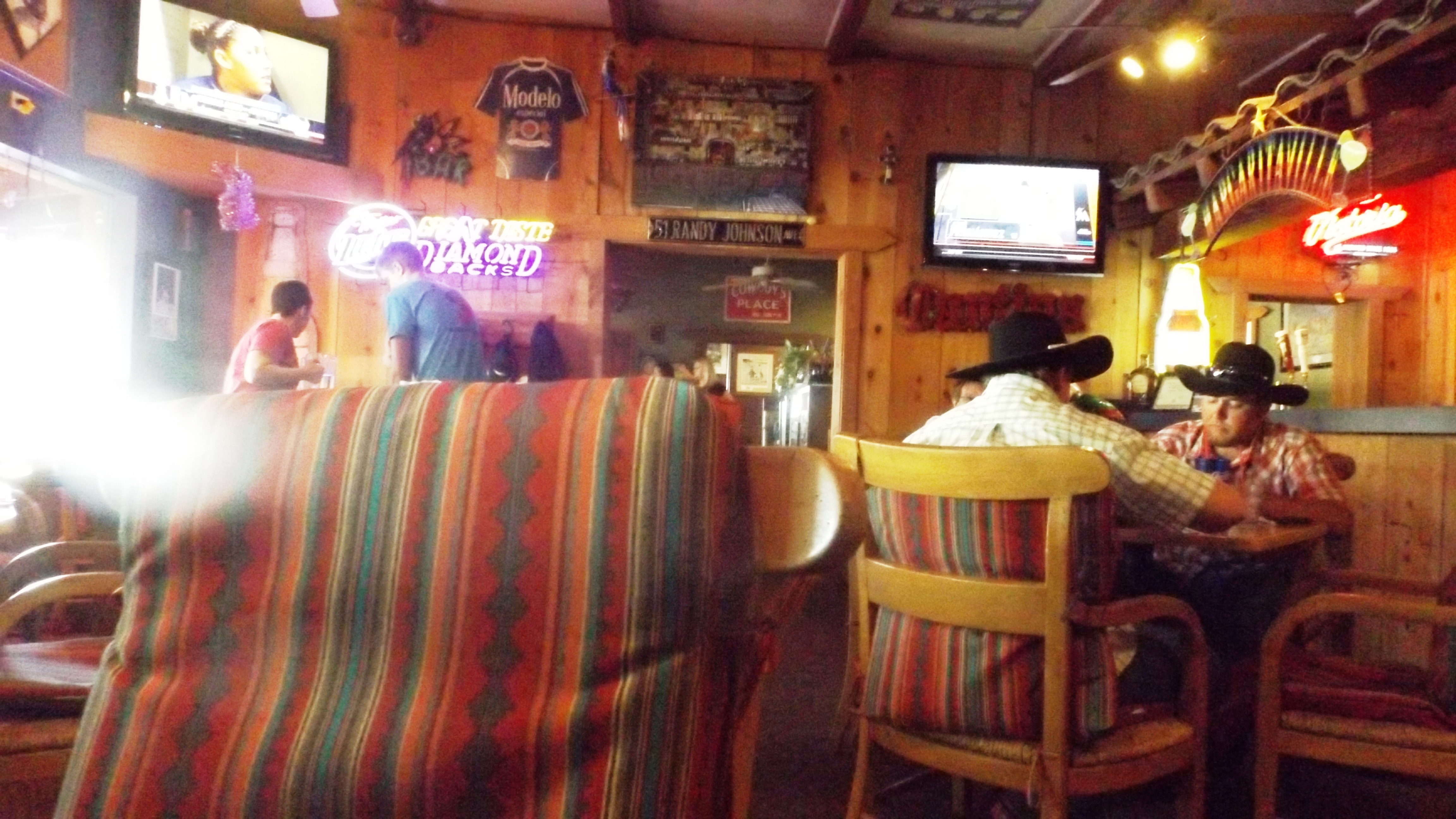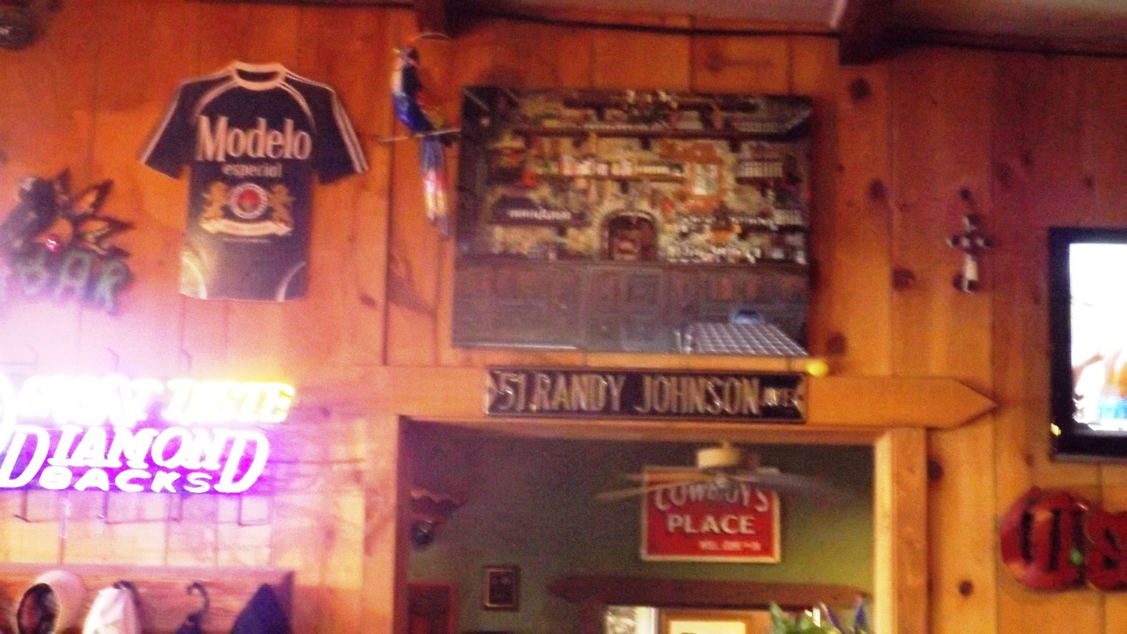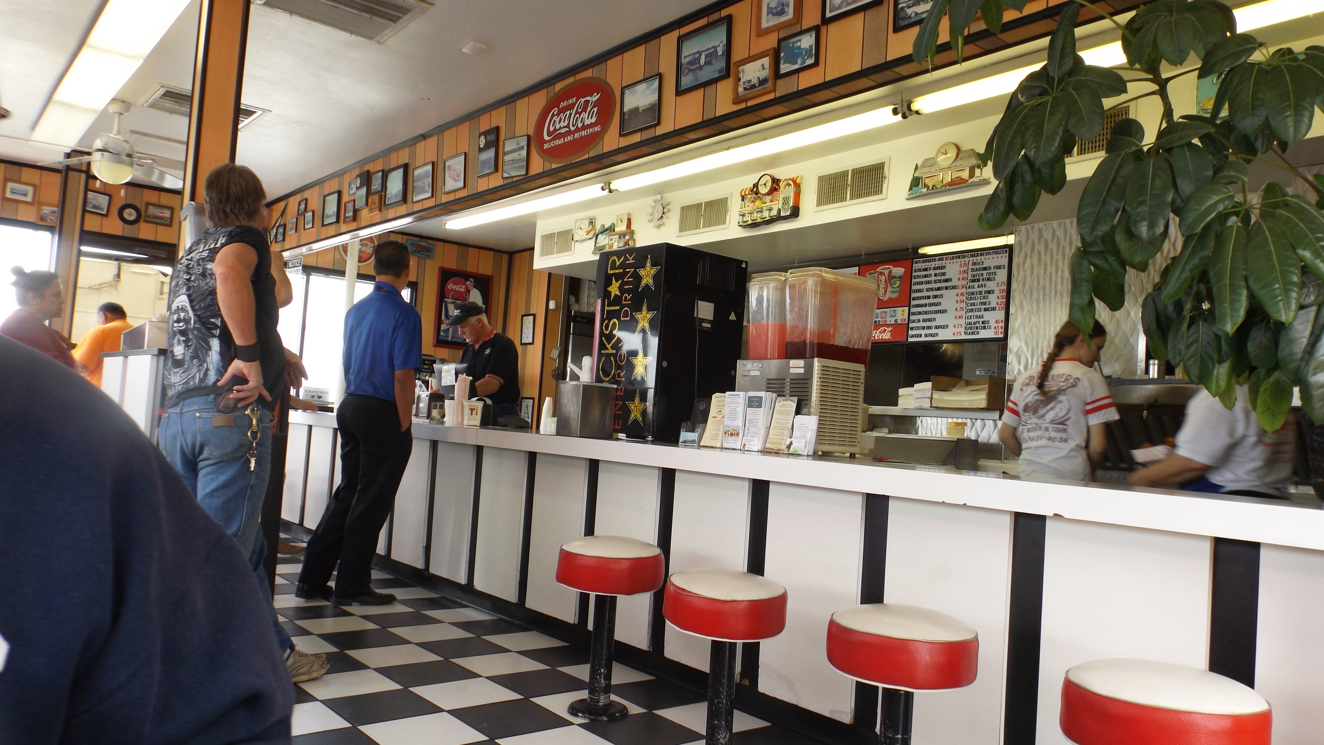 We’ve been Jonesin’ for green chile cheeseburgers since New Mexico, and we finally got them here in Wickenburg, AZ, at Screamers Drive-in. Unlike that chick whose review claimed they stopped in only because the place went by her boyfriend’s nickname, I’m going to give you the straight dope on Screamers: it’s named for classic muscle cars. That means GTOs, Shelby Cobras, Corvettes, the Chevy 409’s, and the later Chevy SS family. 45 rpm vinyl hangs on the wall alongside autographed pictures of various local drag and dirt-track racers.