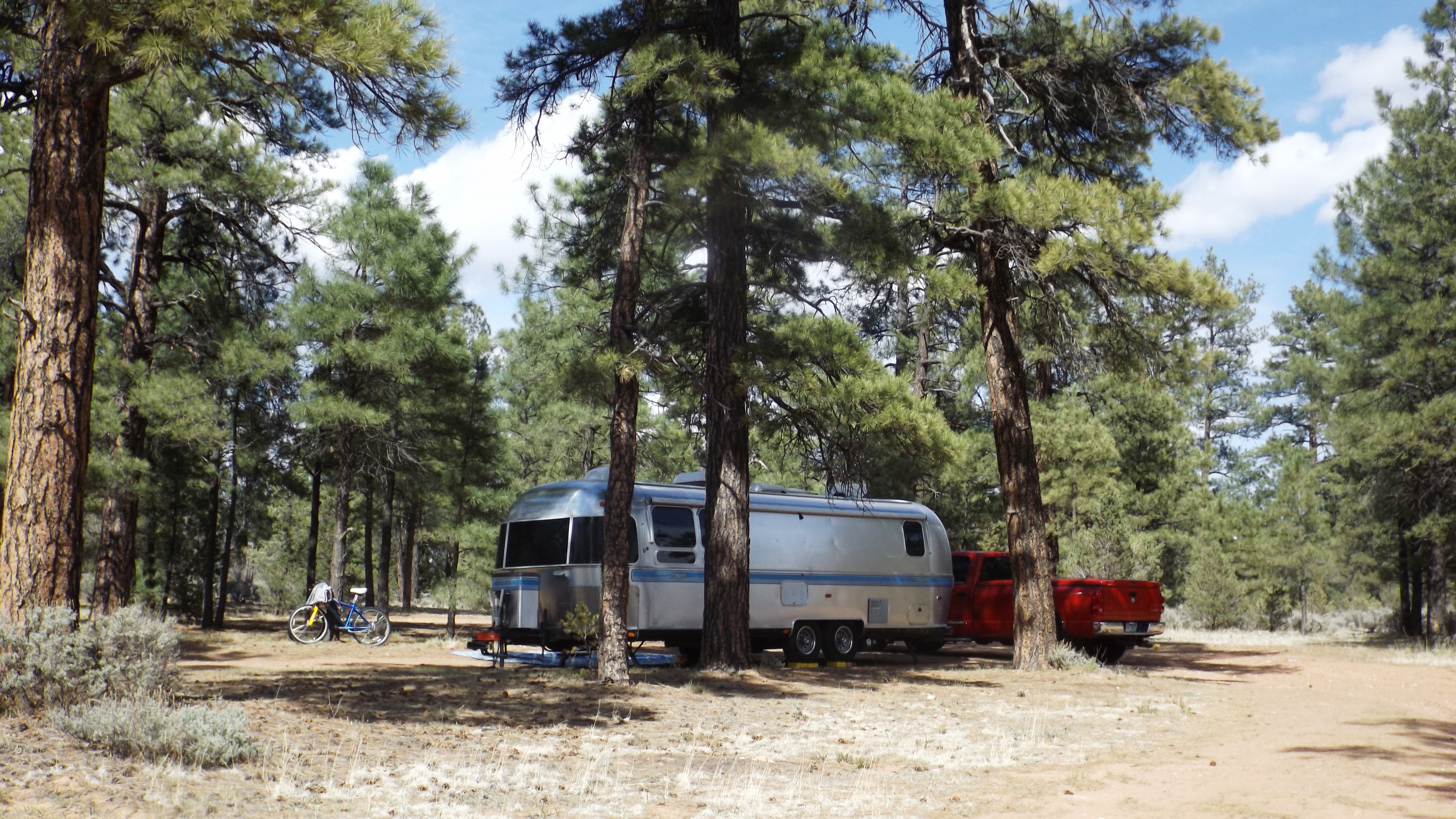 Approaching Grand Canyon from the south, you must pass through Tusayan, AZ, just before you enter the park. We are camped at FR 302 which intersects Hwy 64 one hundred yards before the roundabout at the south end of Tusayan. To get to our wonderful campsite, just turn right on FR 302 while going north, and endure ¾ of a mile of gravel road and washboard. It snowed a couple of inches the day before we arrived which only made the road perfect. There are four or five large secluded sites off this road, all right in the middle of a lovely Ponderosa pine forest. We are near the airport, so there is a lot of helicopter traffic beginning around 9:00 a.m. and ending about 4:00 p.m. We try to be in the park between those hours anyway, and nobody flies after dark. I do not see or hear the wop-wops as a problem.