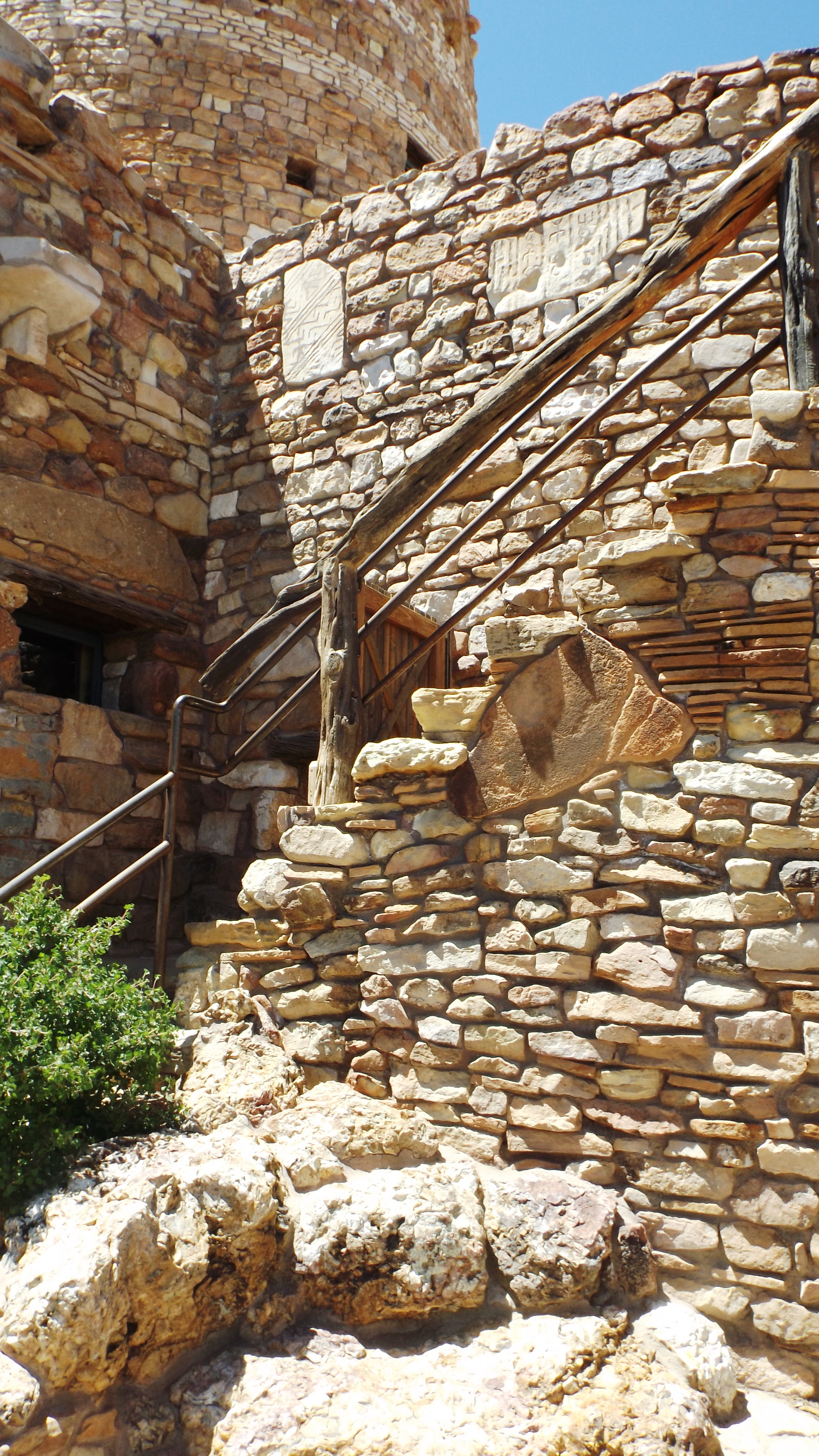 We mentioned Mary Jane Colter in an earlier post. She worked all her life for the Fred Harvey Company, something of a Marriott of that day. The Grand Canyon was popularized by entrepreneurs Kolb and later Harvey. In time the US National Park Service bought them out. But the Canyon has been a tourist attraction as long as there have been tourists. Ms. Colter was among the first female American architects, and she combined a talent for inventing structures on the edge of the Canyon with a knack for selling those ideas to Fred Harvey. The Watchtower, which is at the end of the Desert View Road, is a prime example of those skills. Not one stone was cut or broken. There is a steel skeleton supporting the Watchtower, but the rest is all native stonemasonry. They fitted the rocks into place one by one. That was over 100 years ago. The building yet stands, and in keeping with Fred Harvey’s tradition, they sell a lot of gee-jaws even today.