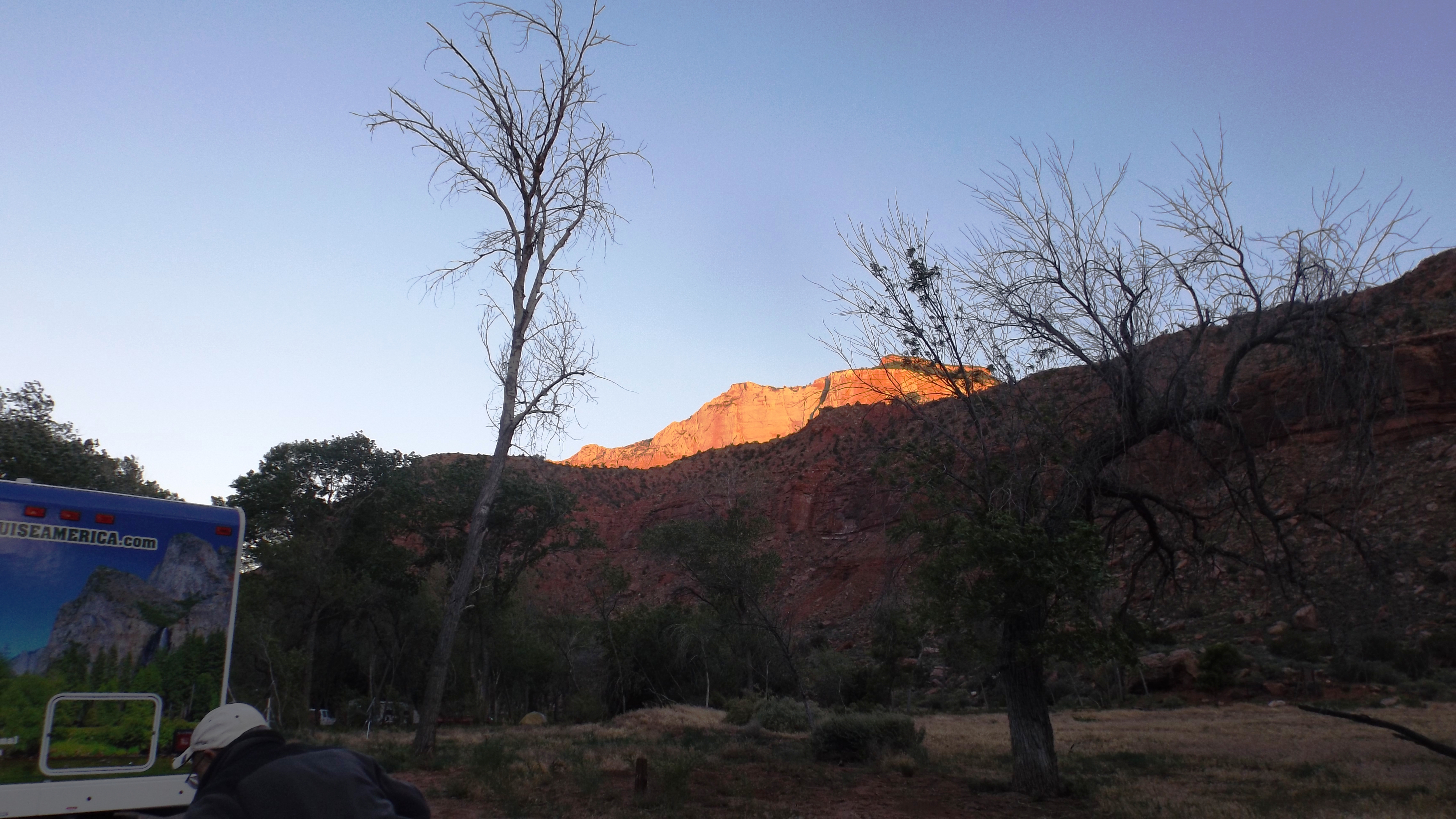 Zion National Park has two campgrounds suitable for RVs and travel trailers. Watchman accepts reservations and is booked up from last month to October; the other (South) is first-come, first-served. The Park Service website warns that reservations are advised, but I am too Mediterranean to plan that far ahead.