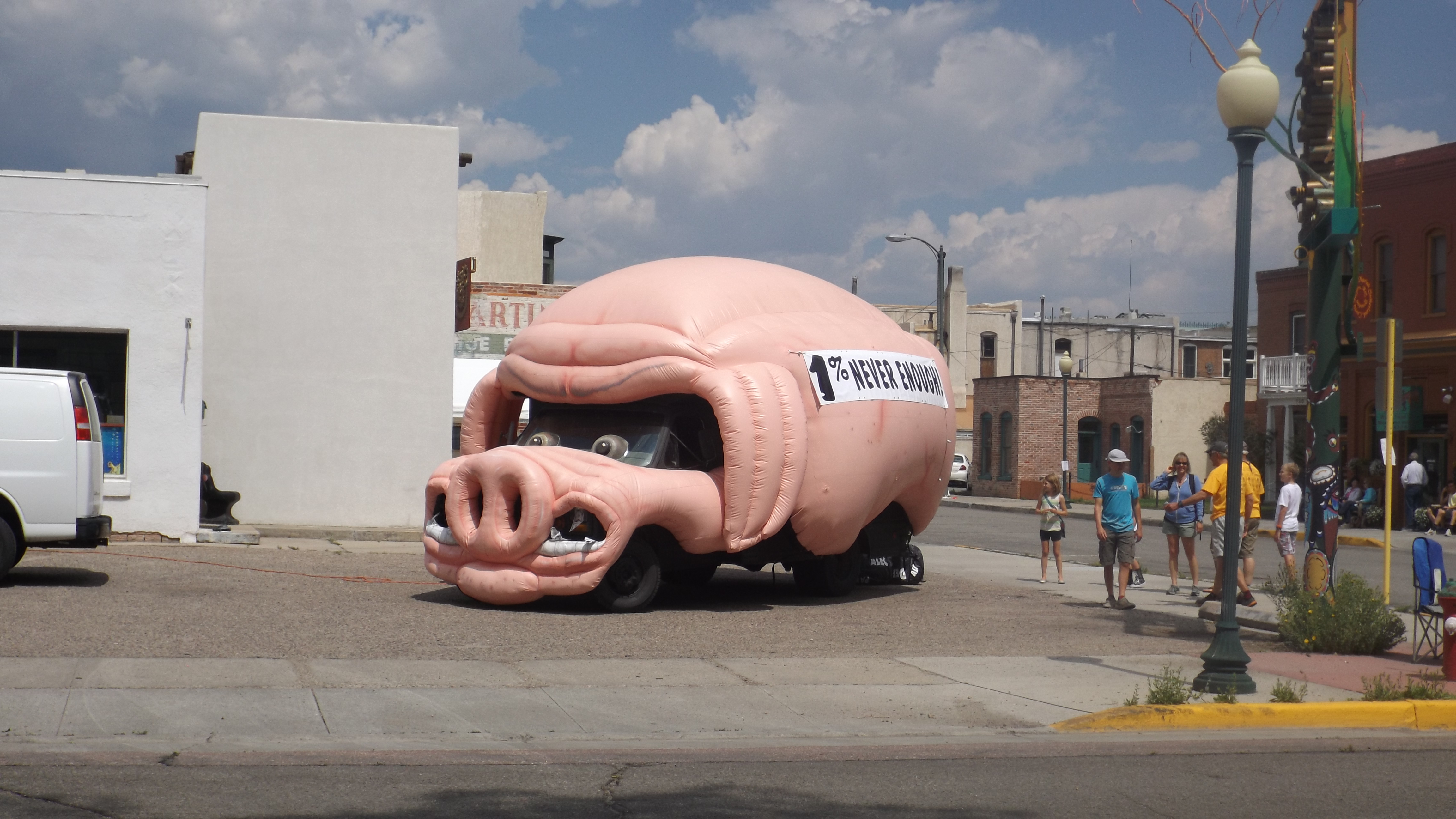 We did eat and drink quite well. There is a wood-fired pizza place called Animas right on the bicycle race route. I had seen their menu in a local washateria, and it looked promising. It was right across the street from The 1% Pig (children were posing as its droppings, alongside its real ones: Greed, Corruption, Misery for the Working Class, etc). We ordered a Montenotte accompanied by porter and brown ale which Animas brews in the back. The pizza was a 12 inch thin crust with a topping of copocollo ham, kalamata olives, Italian sausage, mushrooms, marinara, and fresh oregano. There was hot oil, dried pepper flakes, and freshly shaved Parmesan right there on the table. It was so good we dipped the pieces of crust in the oil and consumed them as greedily as The 1% Pig.