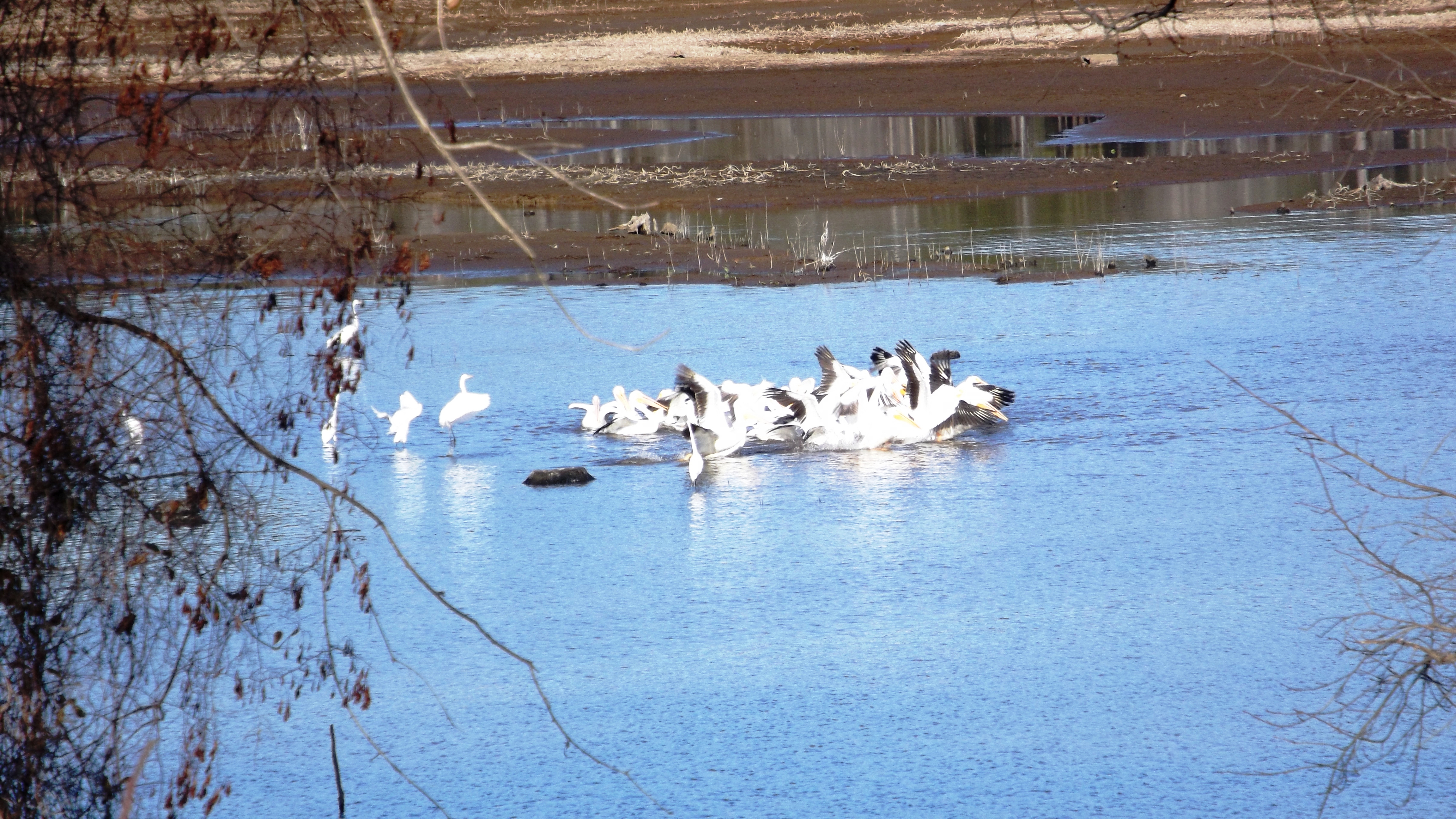 The dam that forms the lake is undergoing repairs, thus the water level was surprisingly low and semi-disgusting. But many a cloud comes with a silver lining, and ours was the pelicans. Those buggers love shallow fresh water. Unlike Louisiana’s state bird, the brown pelican, whites do not dive onto fish. White pelicans catch them from a swimming posture. Whites are also very social, and they love to get together to fish as a group. Put 80 or so white pelicans on a low-water lake and they will put on a show catching breakfast, lunch, and dinner. Here’s how it typically goes. The flock arrives in flight in groups of six to ten. When a leader of the swimming group makes the judgment that “There are enough of us to fish” the birds quickly form a company front (that’s a marching band term for everybody standing side by side in just one row). Then that long skirmish line (a Civil War term for a probing attack) slowly begins to swim toward the bank. Pretty soon the ends circle in toward the middle, cutting off the end run escape route, and then … BAM! Every neck is in the water and there’s a fish in every bill.