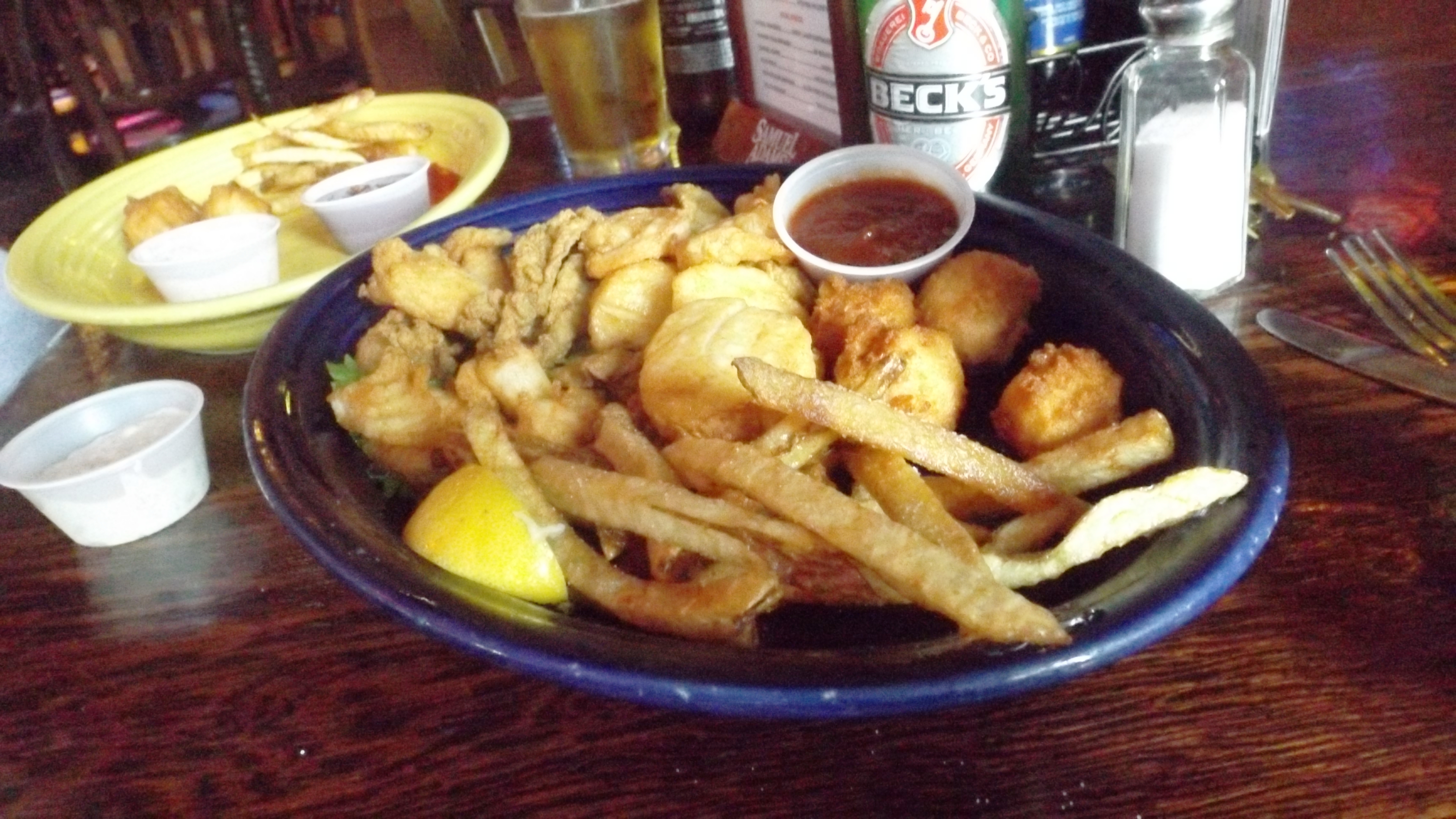 The beaches are lovely if desolate. The village of Ocracoke is on the far end of the island away from the free ferry’s dock. (Don’t think you’re going to pedal your cruiser bicycle from ferry to village: that’s a 30 mile round trip.) The village has a dozen restaurants, several souvenir shops, a lighthouse you cannot enter, and a British cemetery where four poor guys sunk by U-boats in WW II will rest until a storm eventually washes the island away. We split a good fried seafood platter at Howard’s Pub, and counting lunch and our half-hour round-trip from dock to village, two hours was plenty to spend on Ocracoke Island.