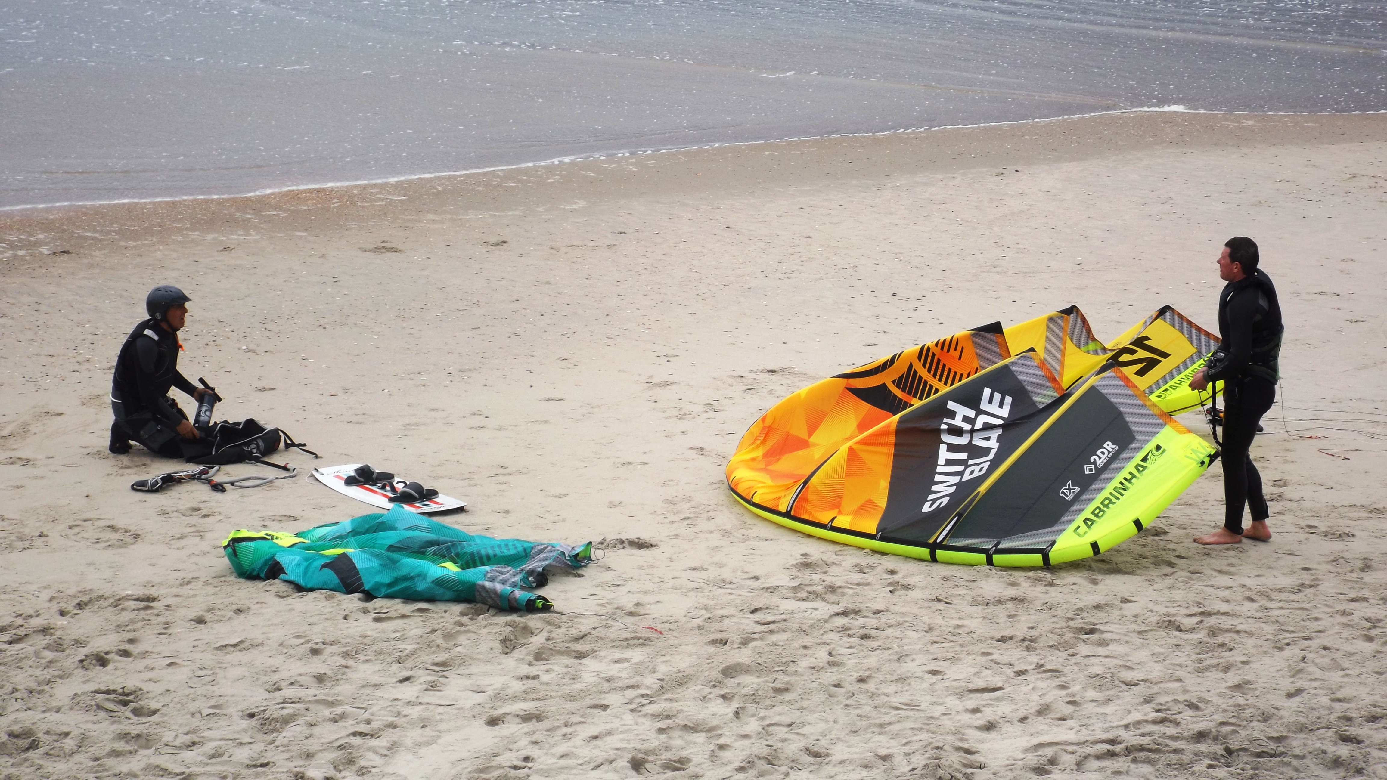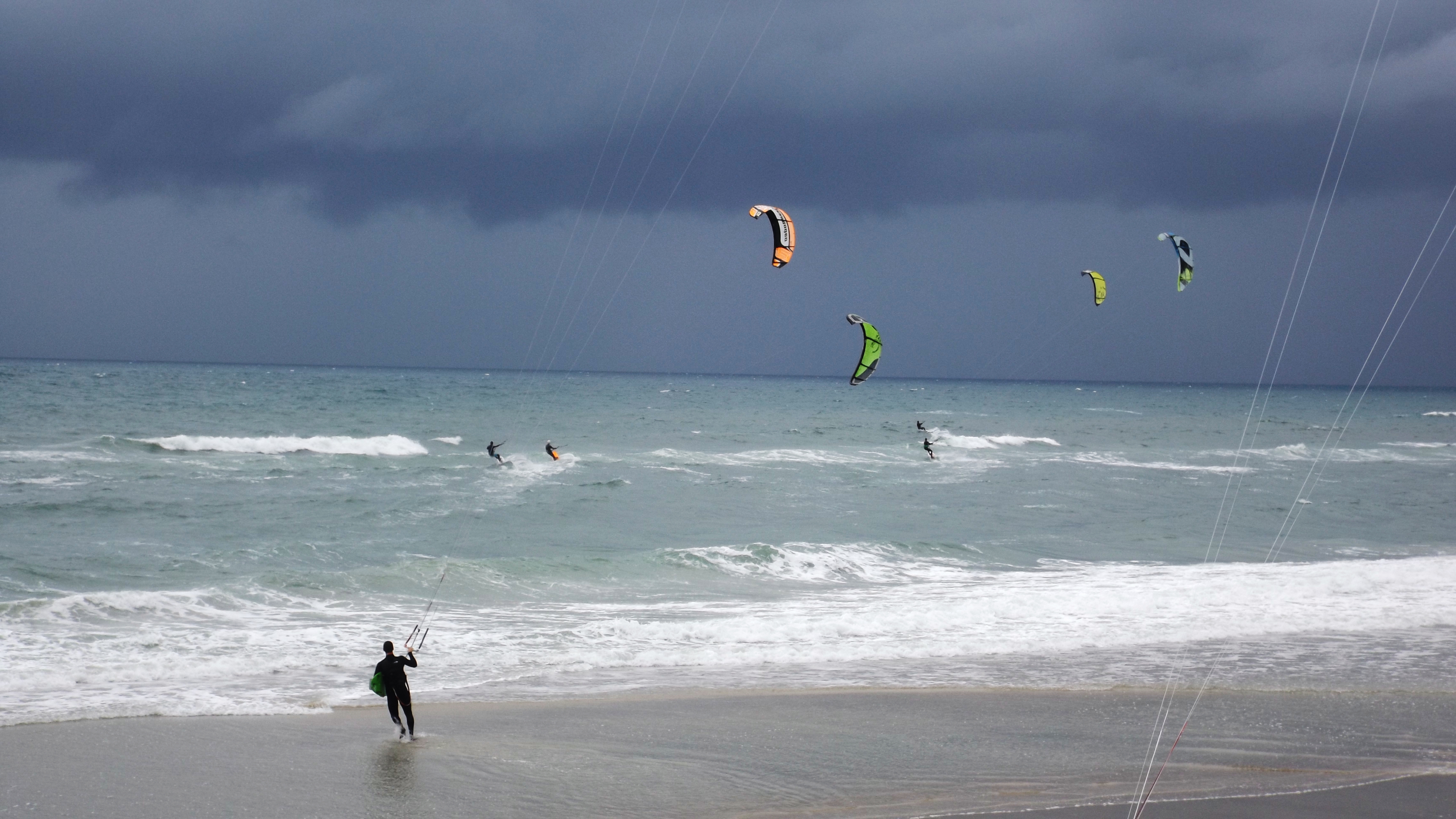 Kite riders like strong winds running parallel to the beach or towards the beach. There is obvious risk of riding strong winds blowing out to sea. We saw mostly guys under kites, but a few gals were out there as well. Kat and I could have done this back in the day. If you can slalom water-ski or stand on a wake board behind a ski boat, you have the strength and balance to kite board. We even saw a couple old enough for bi-focals stowing their gear. But yo, they looked pretty fit for forty-somethings.