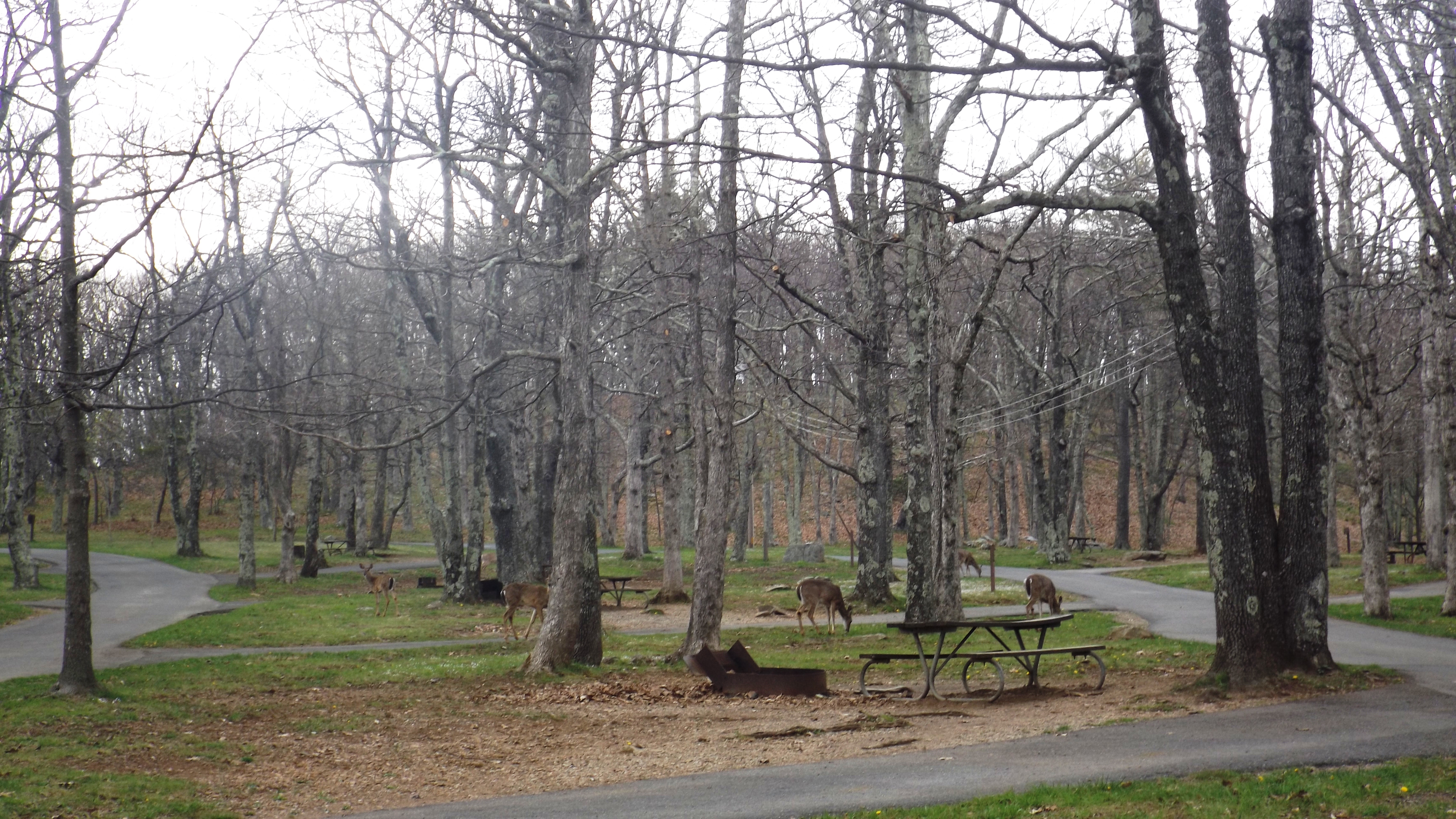 Spring comes late to higher altitudes, and at 3,500’, Big Meadows is high for the East. The dogwoods are just beginning to bloom here; the bears are still sleeping a lot. The days are comfortable with cool, not cold, nights. Our campground opened in late March but has refused to book reservations for dates before May 6. I am writing this on May 6 but today Big Meadows is only 10% occupied. But last Saturday, May 2, was wall to wall people. Every site in this campground was taken by 4:00 p.m. By noon Sunday, May 3, most were gone and it looked like 15% occupancy. Lots of young adults from D.C. and Baltimore drive to Shenandoah with their tents and camp stoves for one night of good sleep and clean air. For now this is Saturday National Park. Later in the season people will reserve sites for several days, but for a while you can drive in Sunday through Thursday without reservations and find a good site that’s available until noon Saturday.