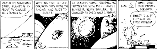 I’ve aged much faster than they have. Lio isn’t a minute older, wiser, not a whit more responsible. Luann is now in college, apparently in her first semester. Brad and Toni are planning a wedding. The deGroots are now perhaps a year older, but I am three. Doonesbury creates a new strip each Sunday, but weekdays seem to be nothing but re-runs. Calvin and Hobbes are up to no new adventures, but it’s been so long since I’ve seen any of them the daily classic that now appears in hundreds of papers still feels new (the non-persistence of memory) and as relevant as ever. If you’ve ever lost focus in a pointless meeting or developed glazed eyes watching a teacher diagram sentences, this week’s Spaceman Spiff series will take you back.