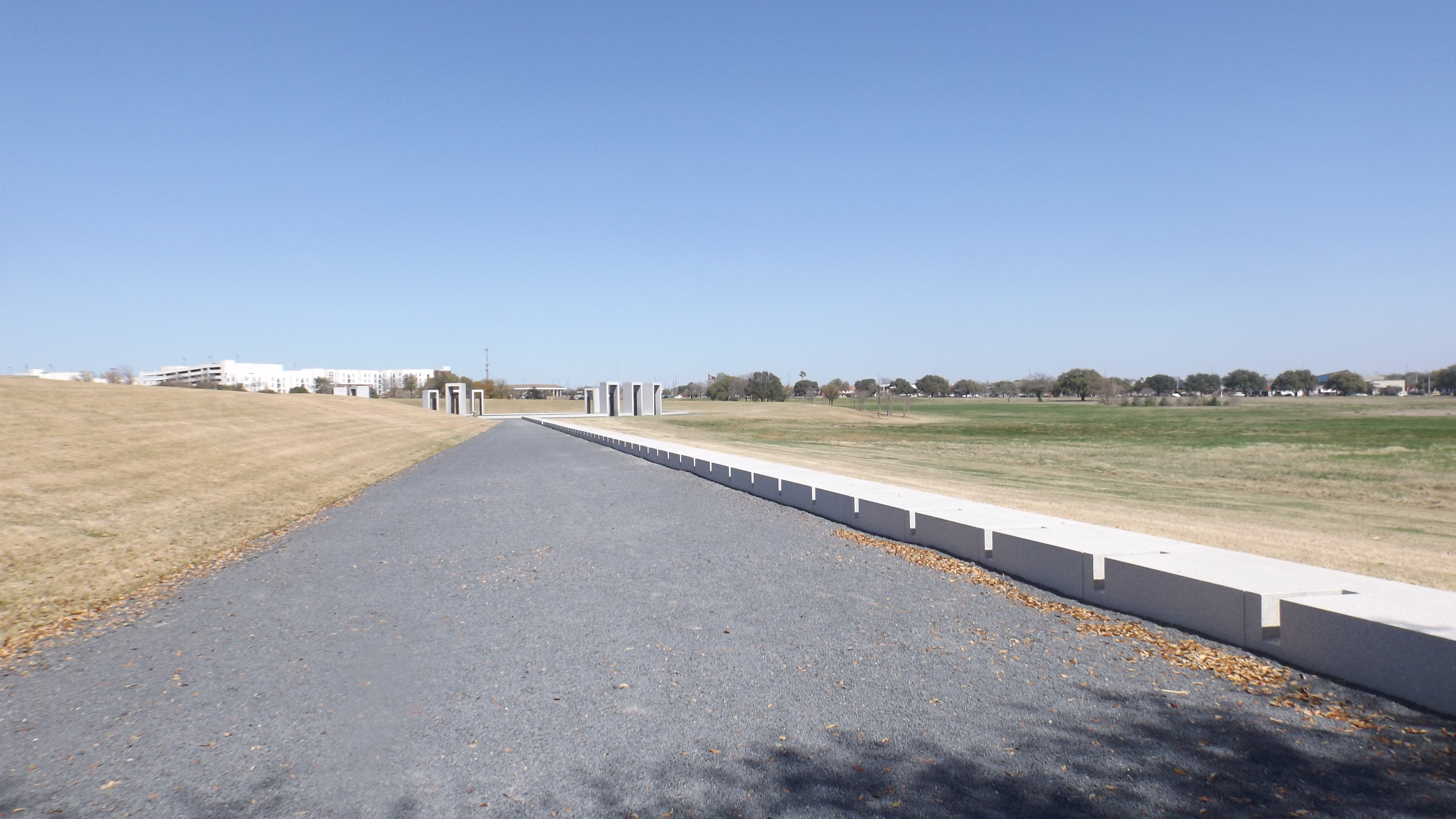 Kat felt a call to revisit Texas A&M’s Bonfire Memorial, and so we did.  The Memorial begins with a landscaped garden of central Texas trees, shrubs, and flowers leading to a massive granite wall inscribed with a quote from “The Spirit of Aggieland” penned in 1926.  Next comes Traditions Plaza with a shaded seating area facing an even larger five verse poem written in 1950, “The Last Corp Trip”.   The walkway to the Spirit Ring is marked with 89 polished grey granite blocks and one black one, each honoring the 90 years Bonfire was stacked, and the 89 years it was lit.  The black block represents 1963 when the stack was dismantled after JFK’s assassination.  “It’s all we have, and the least we can do.”   Finally you come to a circle 170 feet in diameter made of grey granite blocks marking the perimeter fence put up after the stack fell.  27 bronze slats adorn the unmarked granite, one slat for each injured survivor of the stack’s fall.  Above the circle are set twelve portals each honoring an Aggie killed there.  Each portal resembles a huge doorway opening in the exact compass bearing from the center pole marker toward that lost Aggie’s home town.  Each portal has large bronze insets with a carved likeness of each Aggie along with a variety of inspirational and commemorative messages and quotes chosen by his or her family.  It is architecturally brilliant, stunningly executed, and emotionally powerful.