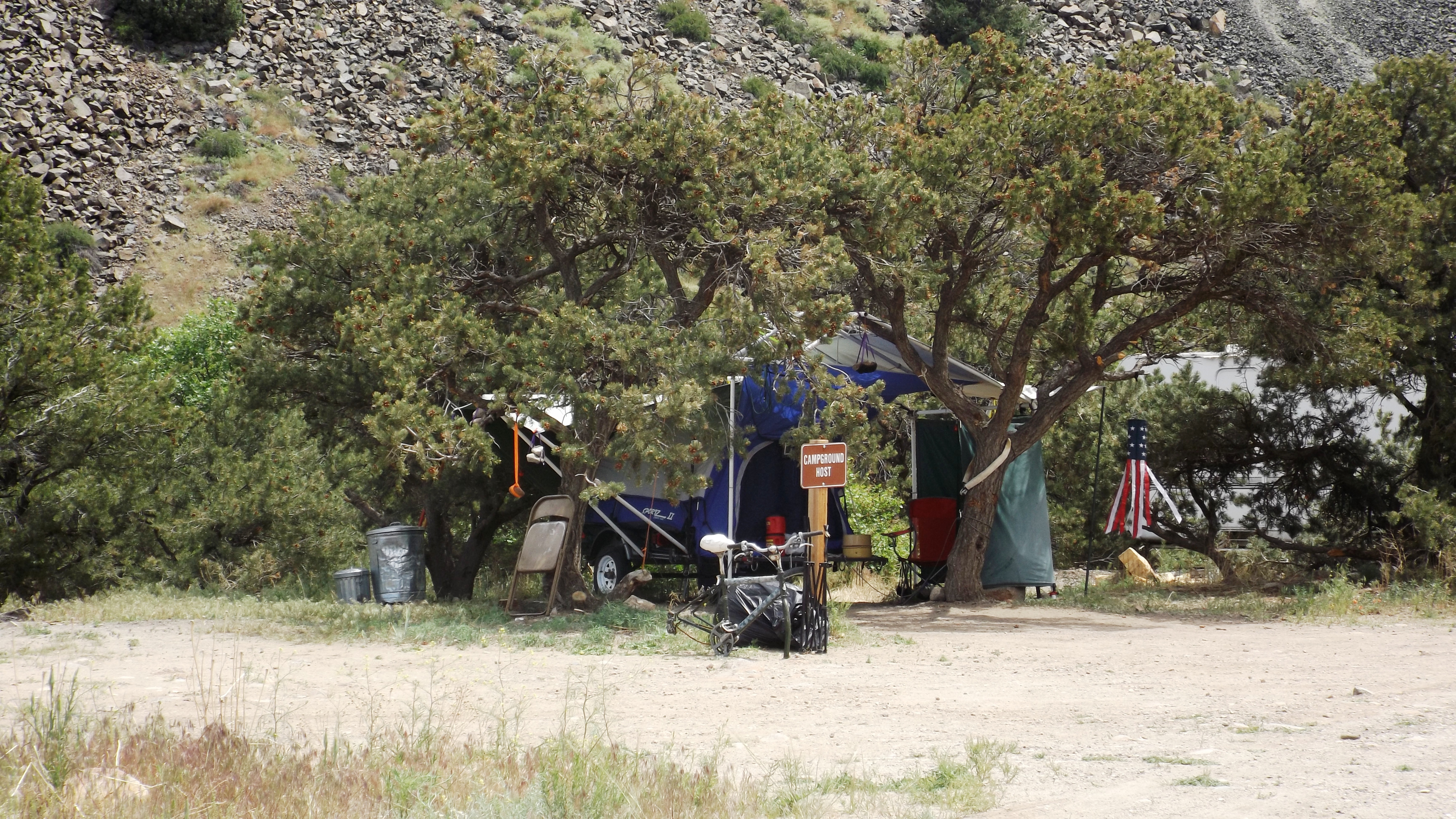 We found a good spot in Bighorn Canyon, the Arkansas Headwaters Rec Authority camp off Hwy 50 just east of Salida. Tired from the Sled’s exertions and pleased with its success, we settled in for Chardonnay and people watching. Kat had just poured the wine when a big shirtless guy stumbled out of his old trailer and collapsed into a lawn chair. An unwashed-looking fellow pedaled past on an old bicycle, and no-shirt yelled at him “Hey, pig-face! You owe me money! I’m talking to you!” Pig-face paid him no mind. Kat thought she saw an old skinny guy tying off a vein, then with his other hand: did he give himself an injection? We couldn’t be sure from the distance. The camp host wandered over to see no-shirt, and both went back inside. 20 minutes later the host came out, and introduced himself. He too was drunk, at 2:00 p.m. He managed to tell us about no-shirt, a redneck that everybody thinks has some degree of military disability from one of our sand-box wars. We decided that he would be known as Cpl Redneck. Host didn’t know Pig-face, but hinted he didn’t exactly want to. The implication was that Pig is a moocher with quick fingers should the chance appear to steal something. Host didn’t know much about Needle Tracks either (I thought he was diabetic?). Arky Fats and Texas Slim are a gal and guy in an old red Camaro who are in some kind of business – they are always negotiating – but Host didn’t know what. We thought of that certifiable loon a/k/a Area 51 from our stay here in 2014. Our conclusion: Free campgrounds with vault toilets, mountains, a river, and a non-enforced 14-day limit are irresistible to the nearly homeless.