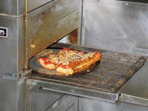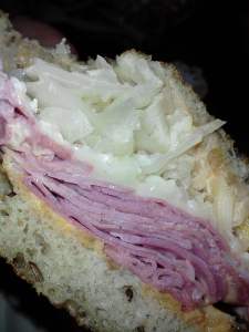 The second, Shortstop Deli, earned its rave reviews.  Kat ordered a very good Reuben, but she found it needlessly padded with kraut.  I had a Hot Truck Pizza Sub of the Suicide variety, loaded with sausage, pepperoni, mushrooms, cheese, and truck sauce piled onto a ten inch split garlicky Italian loaf, baked to crackling crispness.  “Suicide” refers to its grease content (they butter it plenty before loading and baking); health nuts order Sui’s with lettuce and tomato.  Mine (no veggies, please) was incredibly good, but I couldn’t finish it until dinner when it was every bit as good warmed over.  This sandwich comes in three sizes – Regular, Double, and Grand Slam.  Delicious as it was, I’m glad to have ordered a Regular.