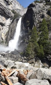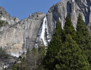 What we did see was perfect weather which came right after a rain/snow event, and that means the waterfalls were at their most spectacular, and the granite formations were well lighted.  Yosemite is primarily a granite and water park, parts of which have really large trees.  I suppose it’s fair to see we saw a bit more than half the park with our highlights including an up close look at Lower Yosemite Falls, El Capitan, the rock climbers’ Everest, and Half Dome, another huge granite formation.  Bridal Veils Falls is another, but those who get really close get really wet.  We would survive that, but Kat’s Nikon might not, so the pictures taken were mostly out of mist range.