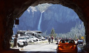Now for a word about crowds: our first day in Yosemite was a Friday.  We chose not to use YARTS bus service but drove the Red Sled without the Airstream.  Our arrival time was a little after 9:00 and we almost had the park to ourselves.  As the day wore on visitors continued to arrive, and very few left.  By about 2:00 p.m. we had seen most of the sights and took our leave.  You should have seen the line of vehicles inbound!  Saturday we chose the same plan – arrive and leave early.  We drove the few mountain roads that were open, and got a good look at Tunnel View where you will see Bridal Veil and Half Dome framed by a tunnel as your ride emerges from a quarter mile passage through sheer granite.   Kat wanted a souvenir magnet and that (around noon) is when we learned every parking space in the park was taken.  I drove a slow block while she purchased her prize, whereupon we bid Yosemite adieu.