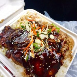 On our own we discovered a food truck featuring Hawaiian food in downtown Tillamook:  Nani Papa’a.  I gnawed superb Korean short ribs with garlic-ginger gravy over rice, garnished with shredded cabbages and carrots (pictured below).  Kat’s Vietnamese shrimp and veggie roll in cellophane pasta was so good she didn’t offer me a taste.  I wanna go back!