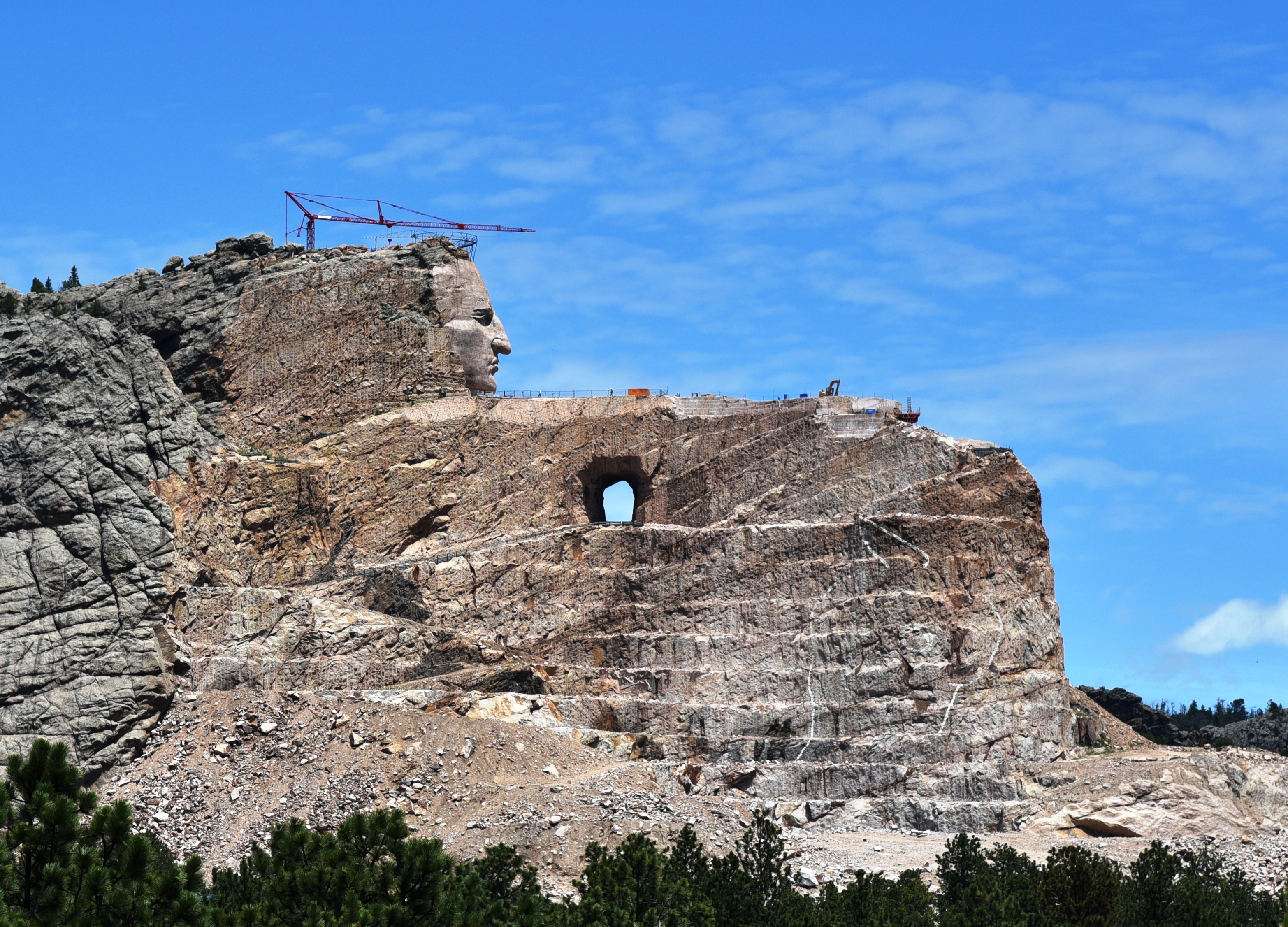 Three generations of Polish Americans have been working together just north of Custer, SD, to blast and chip a mountainside into a monument to the spirit of the American Indian. They have turned this project into a lucrative family business, which incidentally is the American Way, if not the Native American way. In 1939 Chief Henry Standing Bear approached Korczak Ziolkowski, who had served one summer’s apprenticeship to Gutzlon Borglum of Mount Rushmore fame, about building a larger mountain carving as a tribute to the spirit of Native Americans (Chief Henry used the term “Indian”, so henceforth will I.) Korczak sold his wife Ruth on the idea, a deal was struck with the Sioux, and together they set out planning and building this huge monument on a barren hillside purchased from the Federal government via trade of 900 acres of prime farmland from Chief Henry.