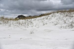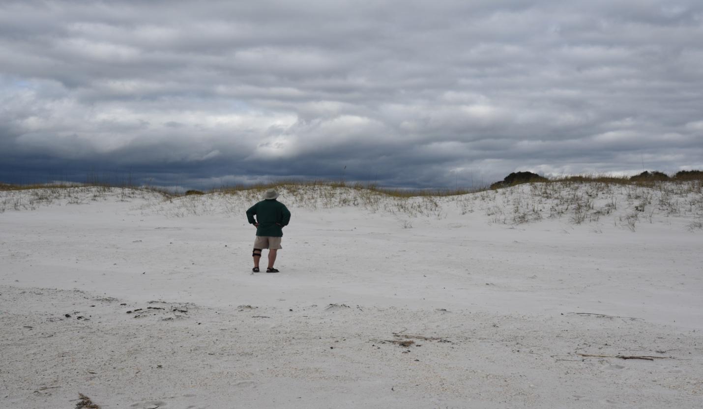 We set out for the beach with a tablespoon and our bag of ashes, parking at Shelter 16.  I wanted a spot above high tide, a place above most storm tides.  Frank Herbert’s Dune series was one of his favorite reads, back in his younger days.  A waterfront dune would have been ideal, but people aren’t supposed to even walk on them.  A nice spot at the foot of a dune overlooking the Gulf seemed just right.  In time a big hurricane will wash away that dune and its vegetation, but until then this is Walt’s beach.  Just behind the dune is the Langdon Battery updated and placed in service in 1943 with two twelve inch guns serving as a WWII shore defense.  Would that I could report that the battery was manned by sailors, but it was a Coast Artillery Corps outpost, then a branch of the Army.  Walt was a Navy guy.  Sorry, dude.